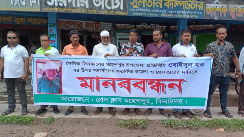 ঝিনাইদহের মহেশপুরে জাতীয় দৈনিক দিনকাল-এর উপজেলা প্রতিনিধি ও প্রেসক্লাব মহেশপুর এর সিনিয়র সহ-সভাপতি ওবায়দুল হকের ওপর সন্ত্রাসী হামলার প্রতিবাদে মানববন্ধন কর্মসূচি পালিত হয়েছে। রোববার বিকেলে মহেশপুর থানা মোড়ে এই কর্মসূচির আয়োজন করে প্রেসক্লাব মহেশপুর।