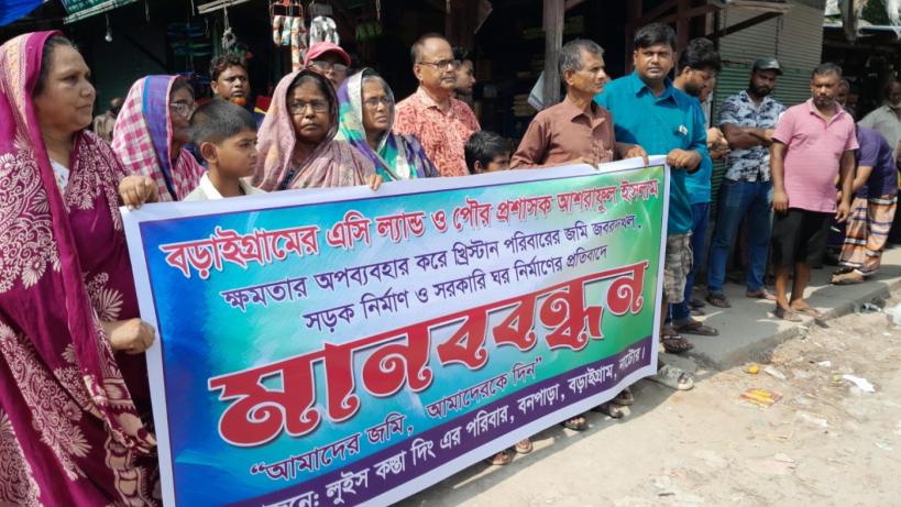 খ্রিস্টান পরিবারের জমি দখলের অভিযোগে মানববন্ধন