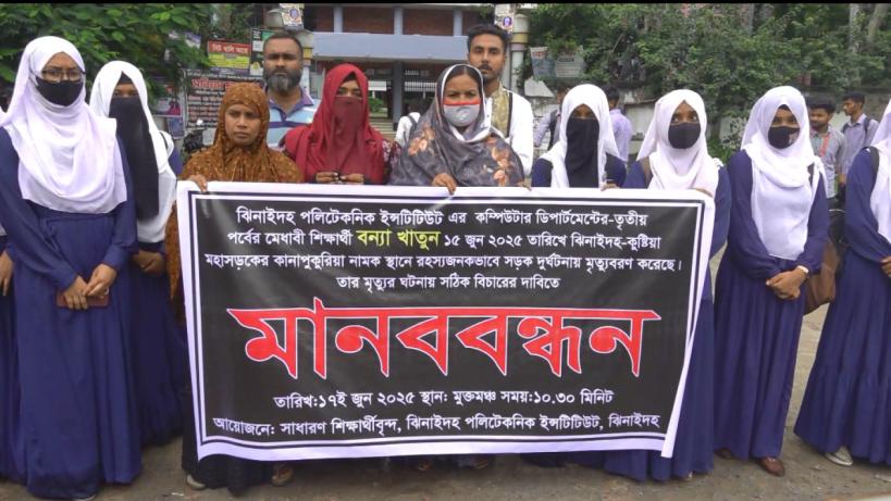 ঝিনাইদহ পলিটেকনিক ইন্সিটিটিউটের ছাত্রছাত্রীরা সহপাঠী বন্যা খাতুনের রহস্যজনক মৃত্যুর ঘটনায় মানববন্ধন করেছে । আজ দুপুরে ঝিনাইদহ-মাগুরা মহাসড়কে পলিটেকনিক ইন্সিটিটিউটের সামনে তারা মৃত্যুর ঘটনা সুষ্ঠ তদন্ত সাপেক্ষে জড়িতদের বিচার দাবী করেন ।