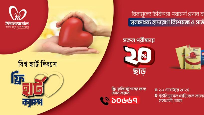 আগামী ২৯ সেপ্টেম্বর ২০২৫, সোমবার, বিশ্ব হার্ট দিবস উপলক্ষে রাজধানীর মহাখালীর ইউনিভার্সেল কার্ডিয়াক হাসপাতাল আয়োজন করেছে দিনব্যাপী "ফ্রি হার্ট ক্যাম্প"। মহাখালী রাওয়া'র বিপরীতে হাসপাতাল প্রাঙ্গণে সকাল ১০টা থেকে রাত ৮টা পর্যন্ত এ ক্যাম্প চলবে।