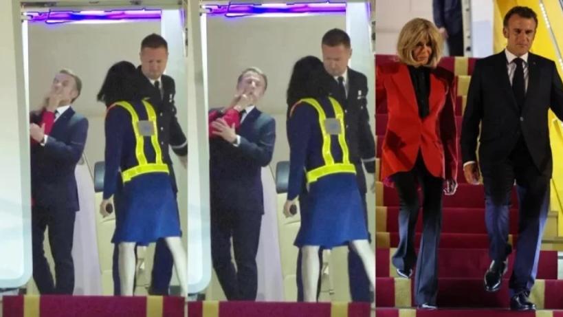 বিমান থেকে নামার সময় ম্যাক্রোঁর মুখে ধাক্কা মারলেন স্ত্রী