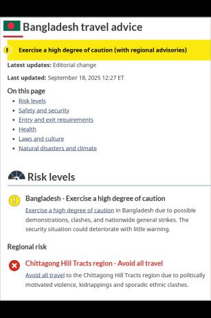 বিজ্ঞপ্তিতে বাংলাদেশ ভ্রমণে সতর্কতামূলক হলুদ চিহ্ন জারি করা হয়েছে। অর্থাৎ উচ্চমাত্রায় সতর্ক থাকতে বলা হয়েছে। আর বাংলাদেশের পার্বত্য তিন জেলায় ভ্রমণের ক্ষেত্রে সতর্কতামূলক লাল চিহ্ন জারি করেছে কানাডার সরকার। অর্থাৎ পার্বত্য অঞ্চল ভ্রমণ নিষেধ করা হয়েছে।