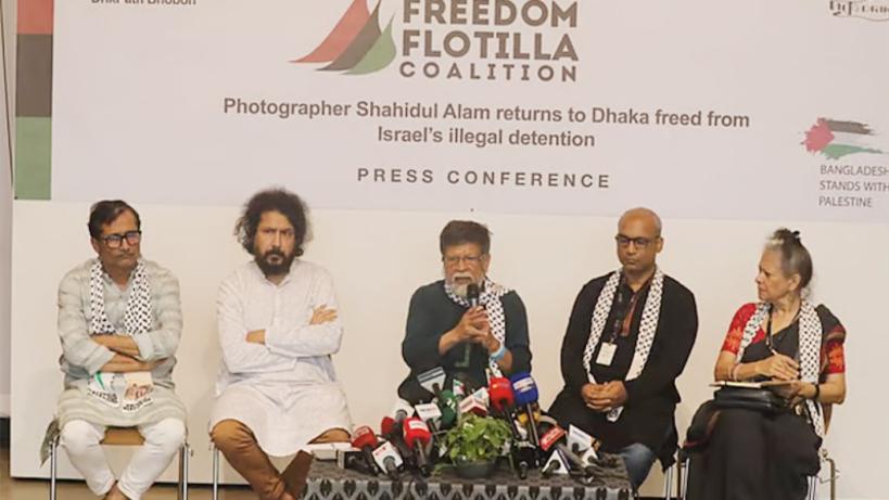 ইসরায়েলি বাহিনী যেখানে মূত্রত্যাগ করে সেখানে আমাদেরকে পেছনে হাত বেঁধে যেখানে হাঁটুমুড়ে বসানো হয়েছিল বলে জানিয়েছেন আলোকচিত্রী ও অধিকারকর্মী শহিদুল আলম। তিনি বলেন, আমাদের ওপর মানসিক অত্যাচার বেশি করা হয়। জেলের ভেতরে আতঙ্কগ্রস্ত করার চেষ্টা করা হয়েছে। এমনকি হামাসের সমর্থক দাবি করে আমাদের একজন সহযাত্রীকে গুলি করে মারারও হুমকি দেয়া হয়।