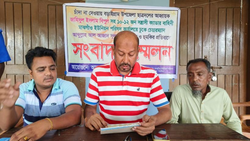 নাটোরের বড়াইগ্রামে উপজেলা ছাত্রদলের আহ্বায়ক জাহিদুল ইসলাম বিপুল কে চাঁদা না দেওয়ায় ৫ নং মাঝগাঁও ইউপি চেয়ারম্যান আব্দুল্লাহ আল আজাদ দুলালকে মারধর ও হুমকির প্রতিবাদে সংবাদ সম্মেলন অনুষ্ঠিত হয়েছে।