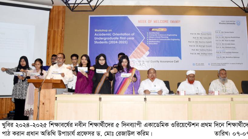 খুলনা বিশ্ববিদ্যালয়ের ২০২৪-২০২৫ শিক্ষাবর্ষের স্নাতক/স্নাতক (সম্মান) প্রথম বর্ষের ভর্তিকৃত শিক্ষার্থীদের 'উইক অব ওয়েলকাম' শীর্ষক ৫ দিনব্যাপী একাডেমিক ওরিয়েন্টেশন আজ ০৭ জুলাই (সোমবার) শুরু হয়েছে। সকাল সাড়ে ৯ টায় বিশ্ববিদ্যালয়ের সাংবাদিক লিয়াকত আলী মিলনায়তনে ওরিয়েন্টেশনের প্রথম দিনের উদ্বোধনী অনুষ্ঠানে প্রধান অতিথির বক্তব্য রাখেন উপাচার্য প্রফেসর ড. মোঃ রেজাউল করিম।