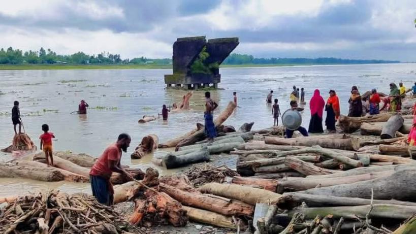 কুড়িগ্রামে কালজানি নদীতে ভেসে আসছে হাজার হাজার গাছের গুড়ি