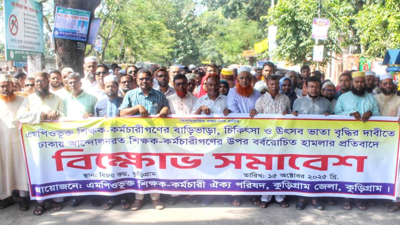 কুড়িগ্রামে এমপিওভুক্ত শিক্ষক-কর্মচারীদের বাড়িভাড়া, চিকিৎসা ও উৎসব ভাতা বৃদ্ধির দাবিতে এবং ঢাকায় আন্দোলনরত শিক্ষক-কর্মচারীদের ওপর বর্বরোচিত হামলার প্রতিবাদে বিক্ষোভ সমাবেশ অনুষ্ঠিত হয়েছে।