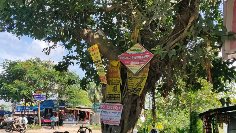 ব্যানার-সাইনবোর্ডে ঢেকে যাচ্ছে হিলির সবুজ গাছ, নীরব প্রশাসন