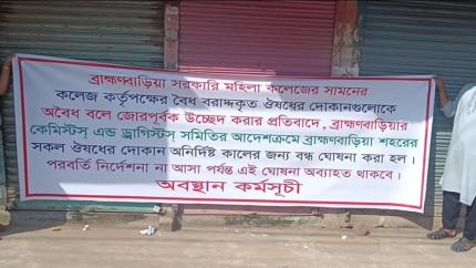 ব্রাহ্মণবাড়িয়া জেলা শহরে অনির্দিষ্টকালের জন্য ওষুধের ফার্মেসি বন্ধ রাখার ঘোষণা