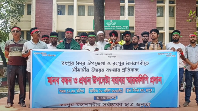রংপুর সদর উপজেলা ও রংপুর মহানগরীতে সীমাহীন উন্নয়ন বঞ্চনার প্রতিবাদে মানববন্ধন ও প্রধান উপদেষ্টার বরাবর স্মারকলিপি প্রদান করেছেন রংপুর মহানগর এর সর্বস্তরের ছাত্র জনতা।